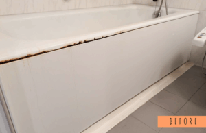 ホーロー製の浴槽ですね。ホーロー製の浴槽はその保温性の高さから昔によく採用されていましたが、傷んだ部分を放置するとサビるなどの腐食を引き起こすなどデメリットもある素材です。交換をオススメしますが、確かに高額になりますね。やってみましょう!